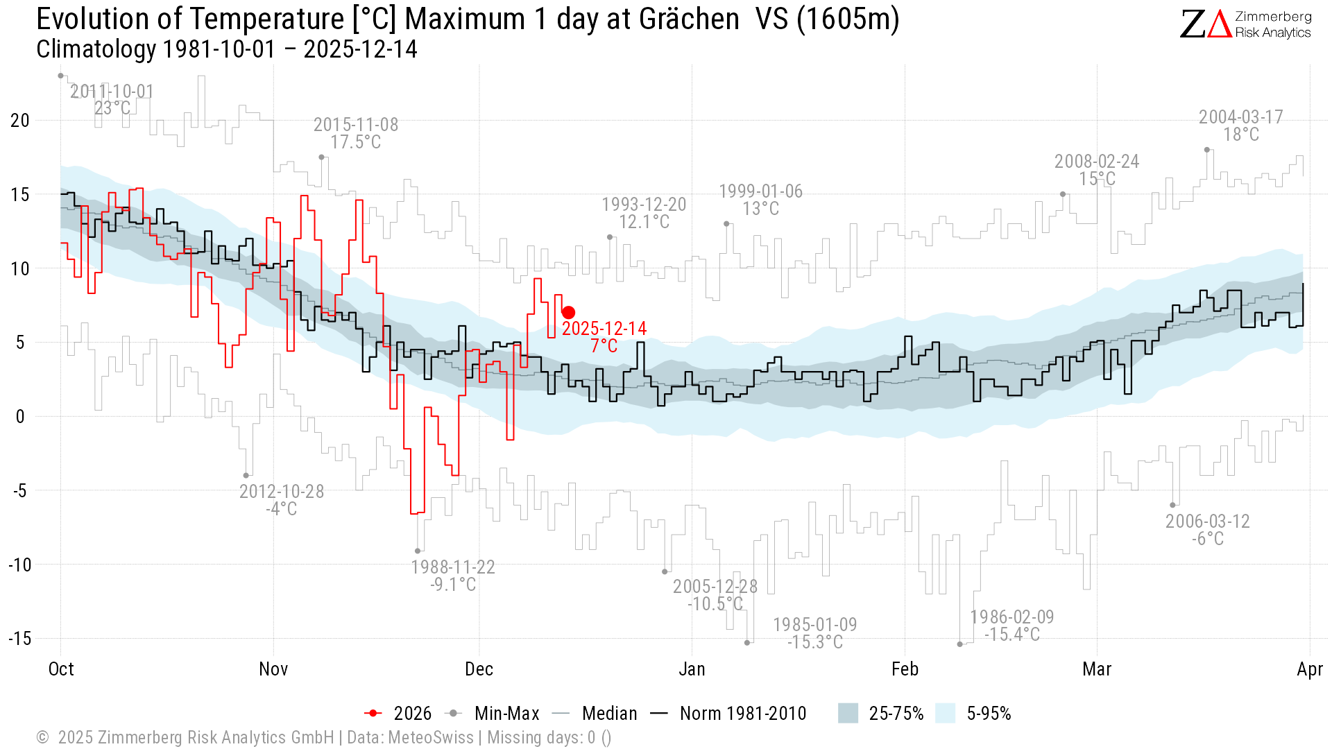 Daily temperature data is provided as-is (inhomogeneous). Please consult measurement site history and see MeteoSwiss website for details